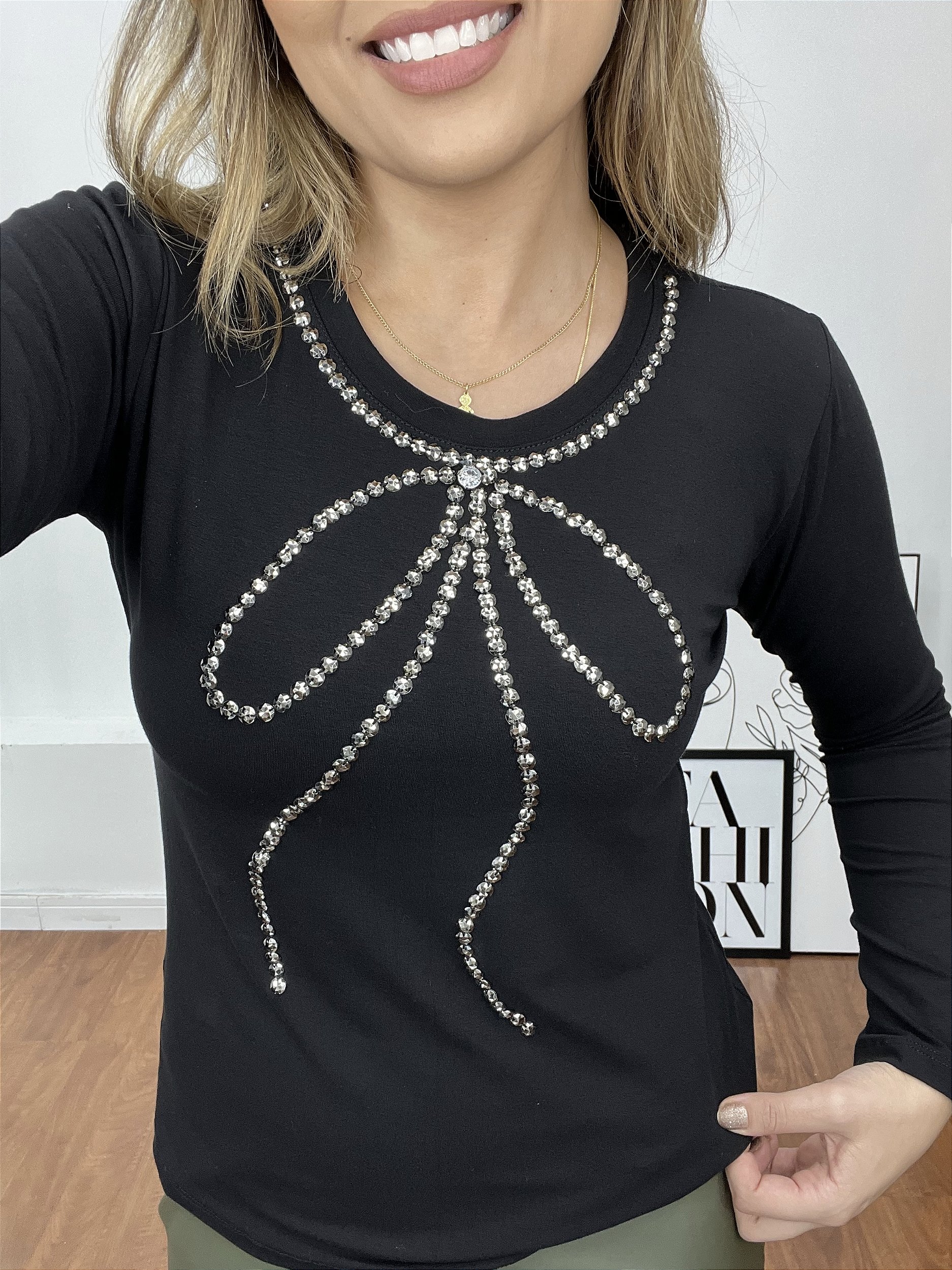 Blusa Manga Longa Decote Redondo Preta Laço Tatá