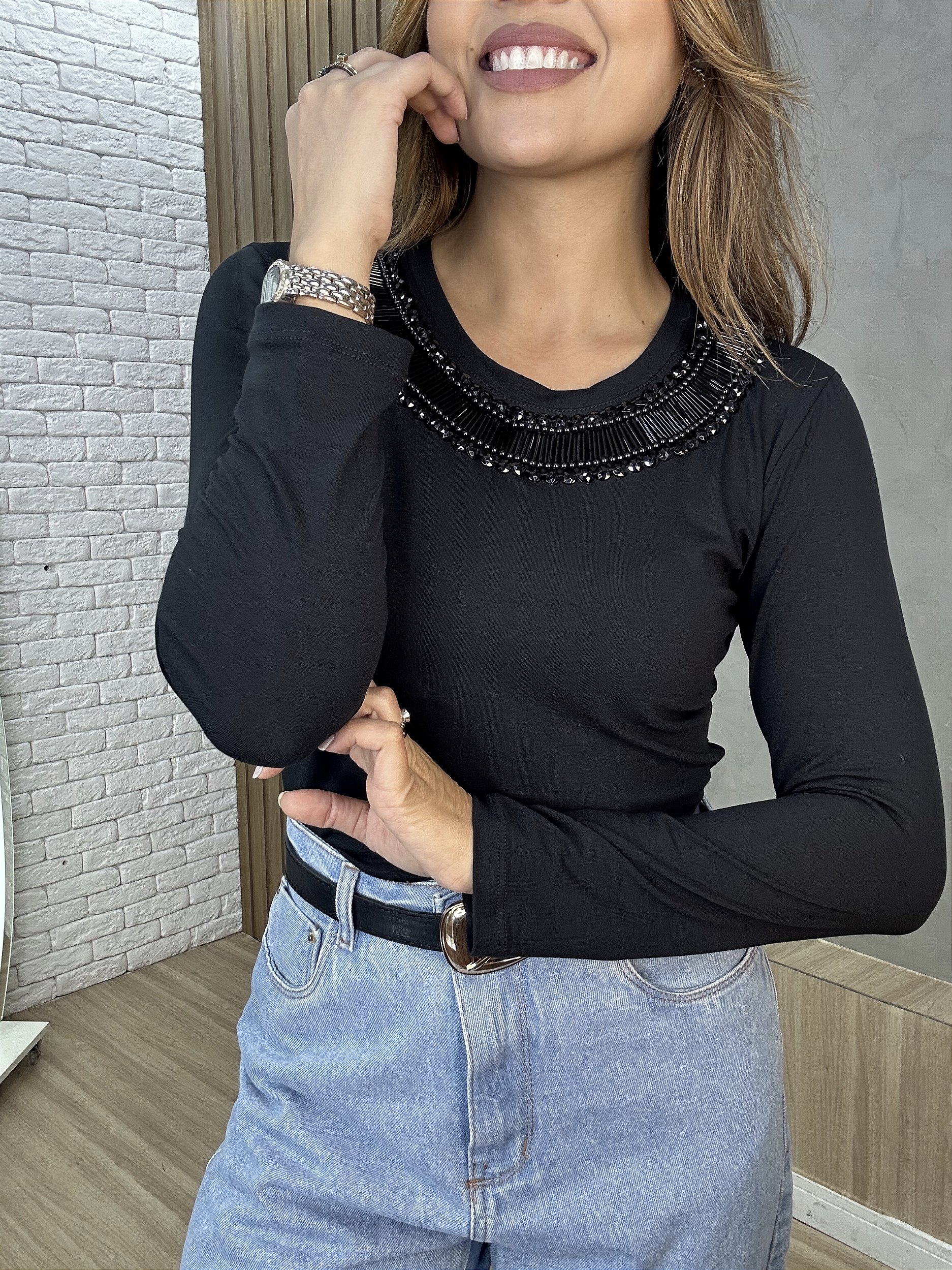 Blusa Manga Longa Decote Redondo Preta Samira