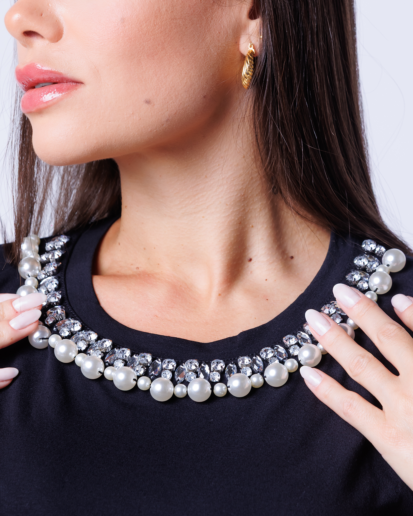 Bordado manual, com linha dupla garantindo maior fixação das pedras.