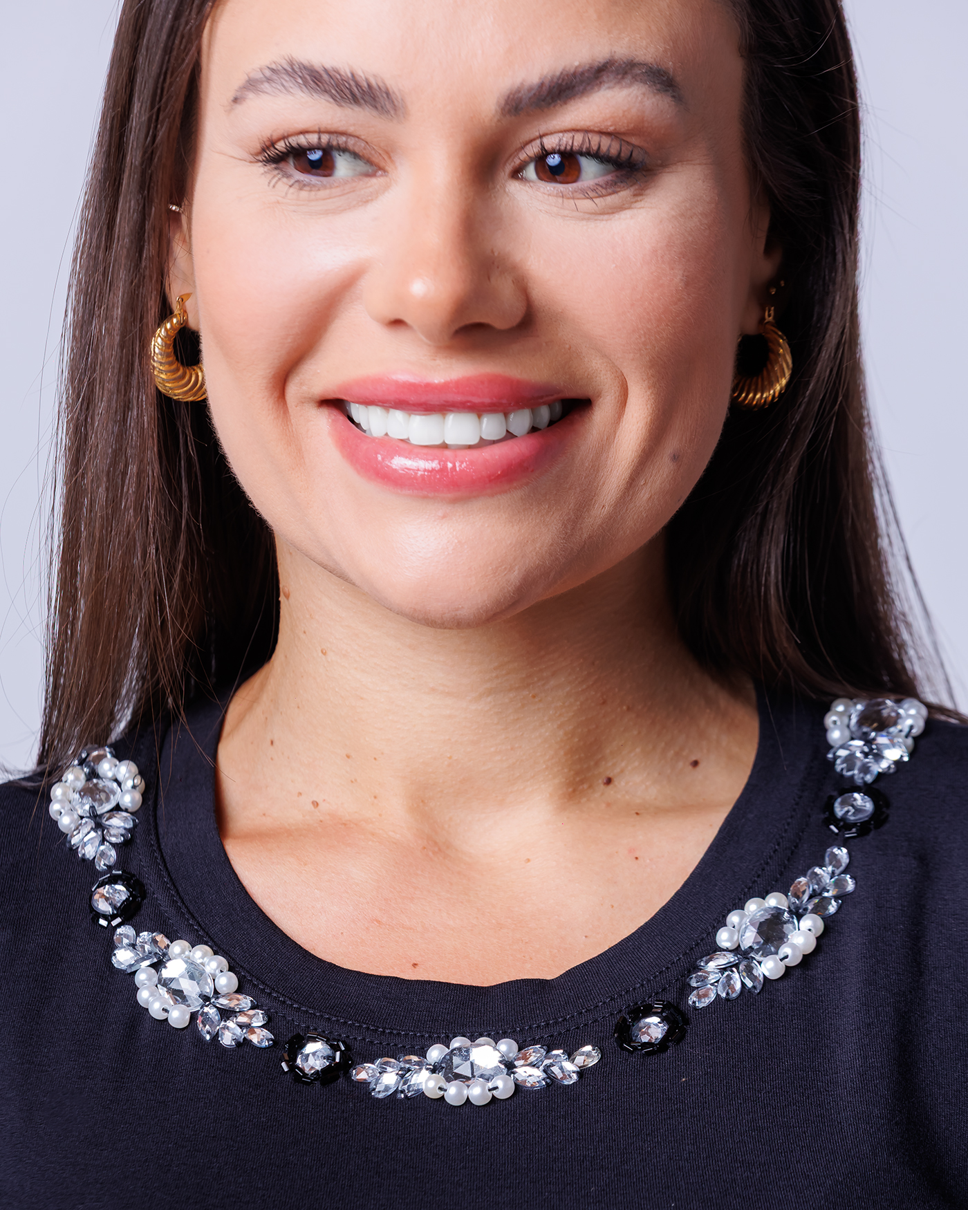 Bordado manual, com linha dupla garantindo maior fixação das pedras.
