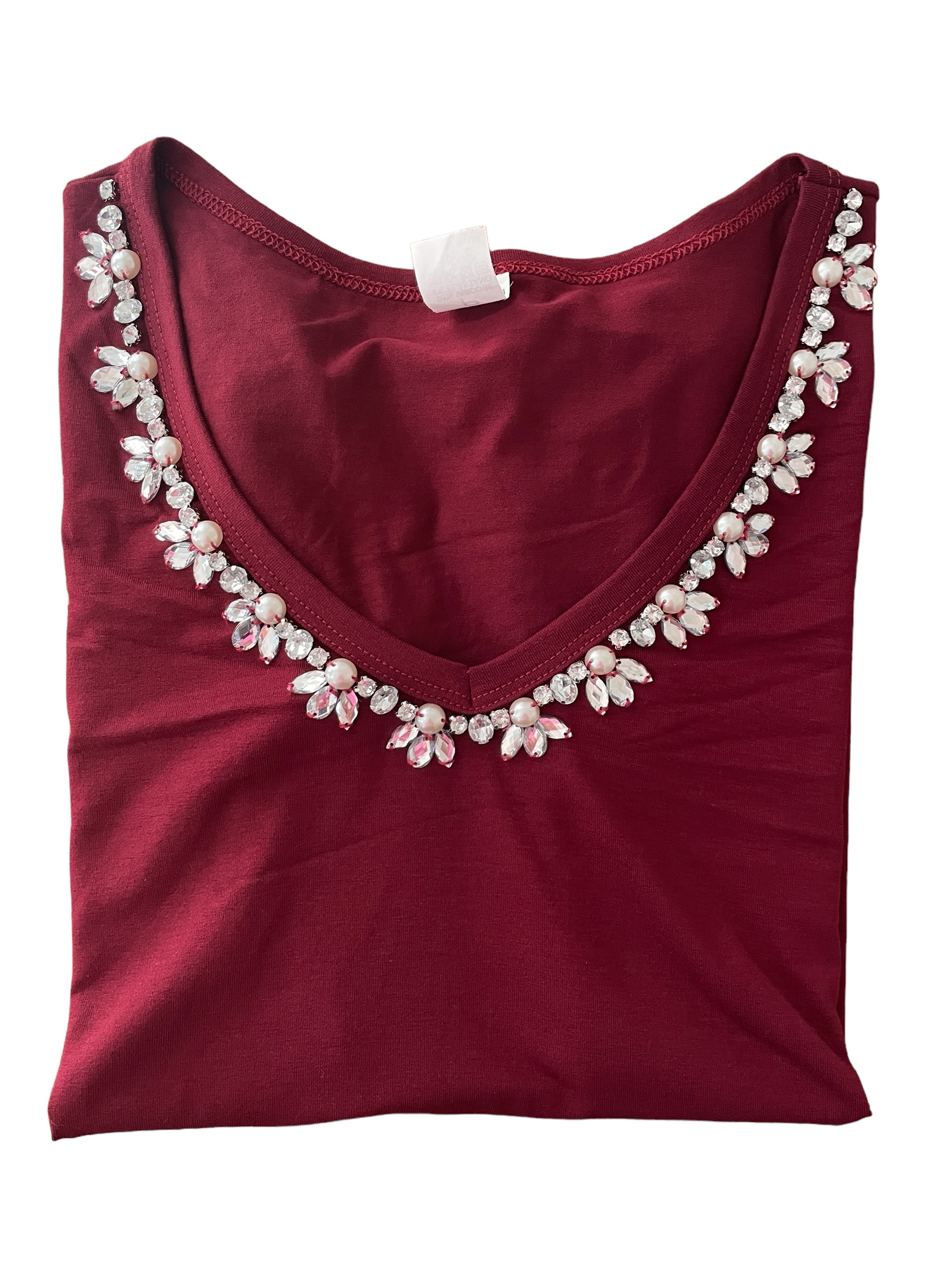 Bordado manual, com linha dupla garantindo maior fixação das pedras.